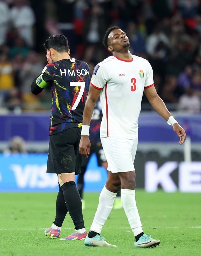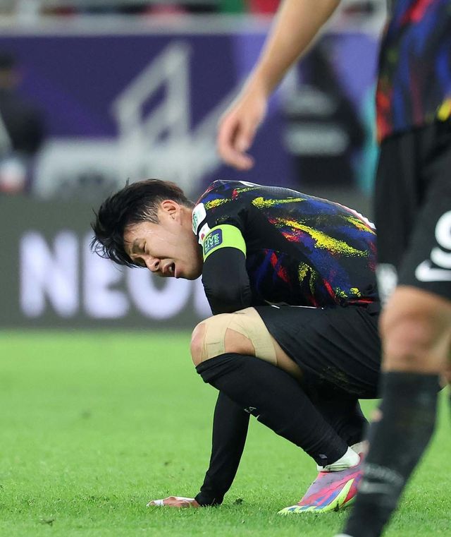 손흥민이 7일 카타르 알라이얀 아흐메드 빈 알리 스타디움에서 열린 2023 아시아축구연맹(AFC) 카타르 아시안컵 준결승 요르단과 대한민국의 경기에서 0-2로 패색이 짙어지자 아쉬워하고 있다. / 뉴스1