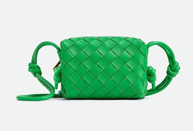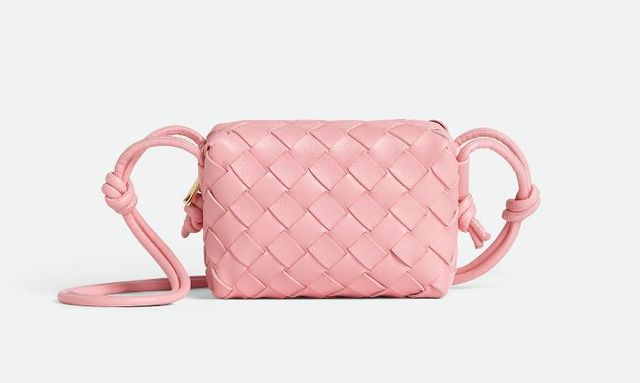 보테가베네타의 시그니처, 인트레치아토 위빙으로 완성한 백. 마이크로 사이즈로 에어팟, 립스틱, 열쇠 등 작은 사이즈의 물건들을 수납하기에 좋은데요. 콤팩트한 사이즈이지만, 러블리한 컬러로 룩에 포인트를 더할 아이템이죠. 가격은 170만 원 대.