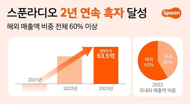 글로벌 오디오 소셜 플랫폼 스푼을 운영하는 스푼라디오가 2022년에 이어 2023년에도 영업이익을 내며 2년 연속 흑자를 기록했다고 밝혔다.