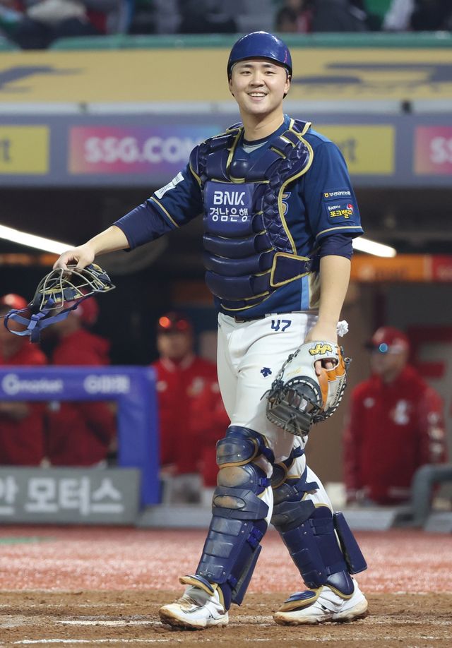 2023 KBO 프로야구 포스트시즌 SSG랜더스와 NC다이노스의 준플레이오프 2차전 경기가 23일 오후 인천SSG랜더스필드에서 열렸다. 9회말 경기가 끝나자 포수 김형준이 일어나 더그아웃으로 보며 웃고 있다. 인천=김민규 기자