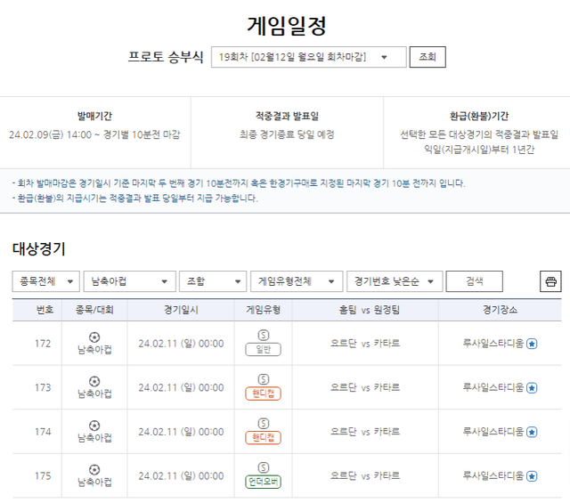 프로토 승부식 19회차 중 요르단-카타르전을 대상으로 한 게임은 ▲일반(172번) ▲핸디캡(173번) ▲소수핸디캡(174번) ▲언더오버(175번)의 네 가지 유형 즐길 수 있다. 프로토 승부식 19회차의 배당률은 발매와 동시에 공지되며, 발매 마감은 오는 2월 11일 오후 9시 50분이다.