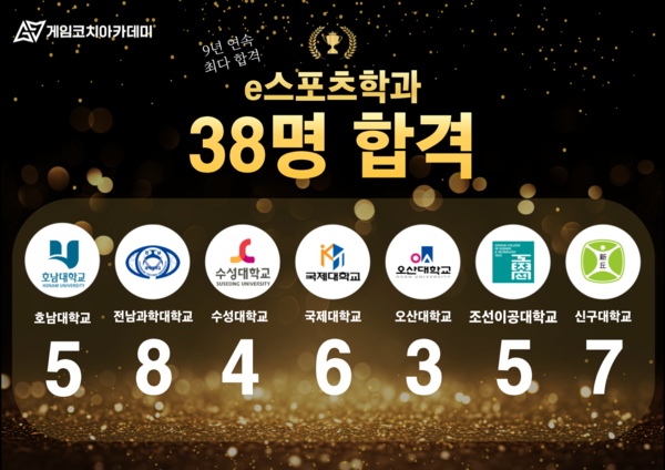 지난해 9월부터 11월까지 진행된 1, 2차 수시모집에 응시한 게임코치 수강생들은 호남대학교(5명), 전남과학대학교(8명), 수성대학교(4명) , 국제대학교(6명), 오산대학교(3명), 조선이공대학교(5명), 신구대학교(7명) 등에 합격하는 성과를 이루었다.