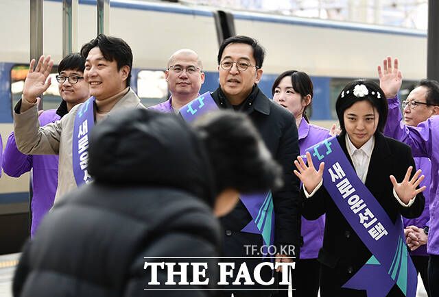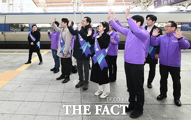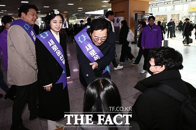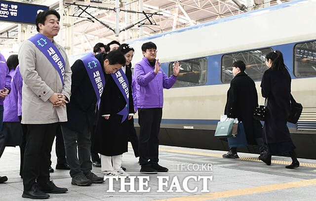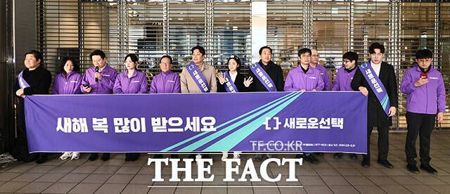 [더팩트ㅣ박헌우 기자] 새로운선택 금태섭·조성주 공동대표와 류호정 시민소통위원장 등 당직자들이 8일 오전 서울 용산구 서울역에서 설 명절 귀성 인사를 하고 있다.