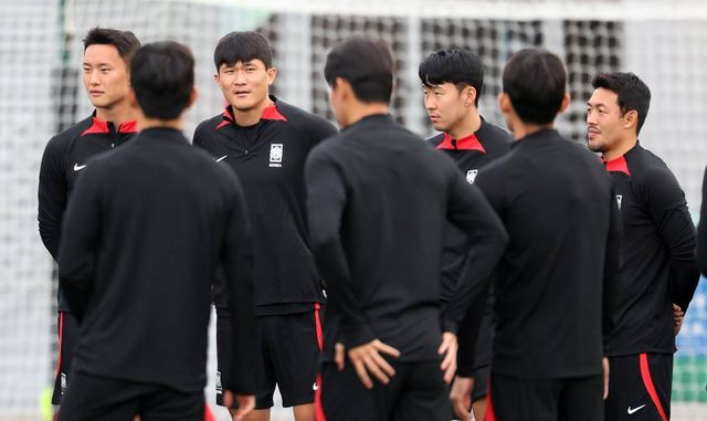 클린스만 감독 발언 듣는 정승현(왼쪽부터), 김민재, 손흥민, 이기제 / 뉴스1