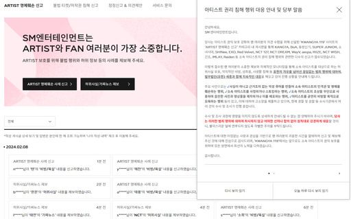 8일 SM은 광야119 홈페이지 공지를 통해 "당사는 아티스트 권익 보호 강화와 팬 여러분의 의견 수렴을 위해 신설된 'KWANGYA 119' 사이트의 'ARTIST 명예훼손 신고' 카테고리 내 게시판을 통해 소속 아티스트들의 권리 침해 행위와 관련한 다수의 신고가 접수됐다"고 밝혔다.