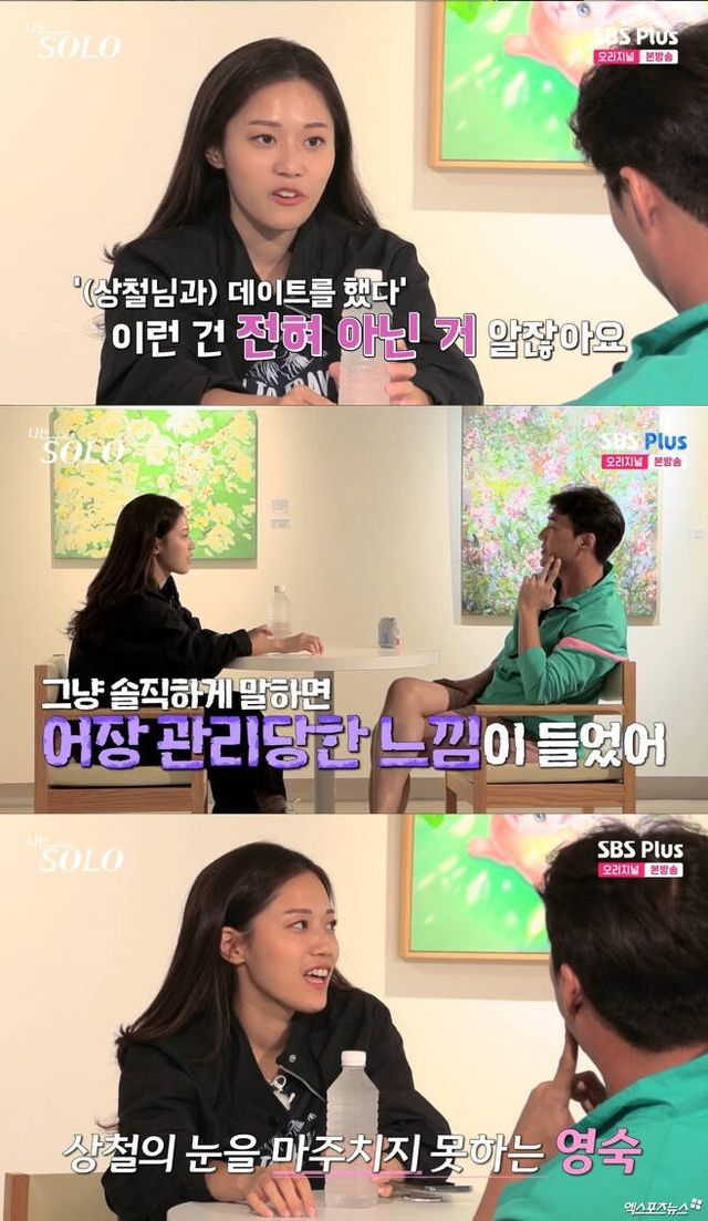 그런가 하면 영숙은 지난달 31일 방송분에서 제작진과의 인터뷰에서 "그냥 좋은 분인 것 같다. 사람이 그냥 괜찮은 사람이다. 그런데 이성적인 끌림은 덜하는 것 같다. 내가 봤을 때 뽀뽀하고 싶은 사람과 사귀는데 상철님은 100번 보면 뽀뽀하고 싶을까 잘 모르겠다. 지금은 아니"라고 솔직하게 발언했다.