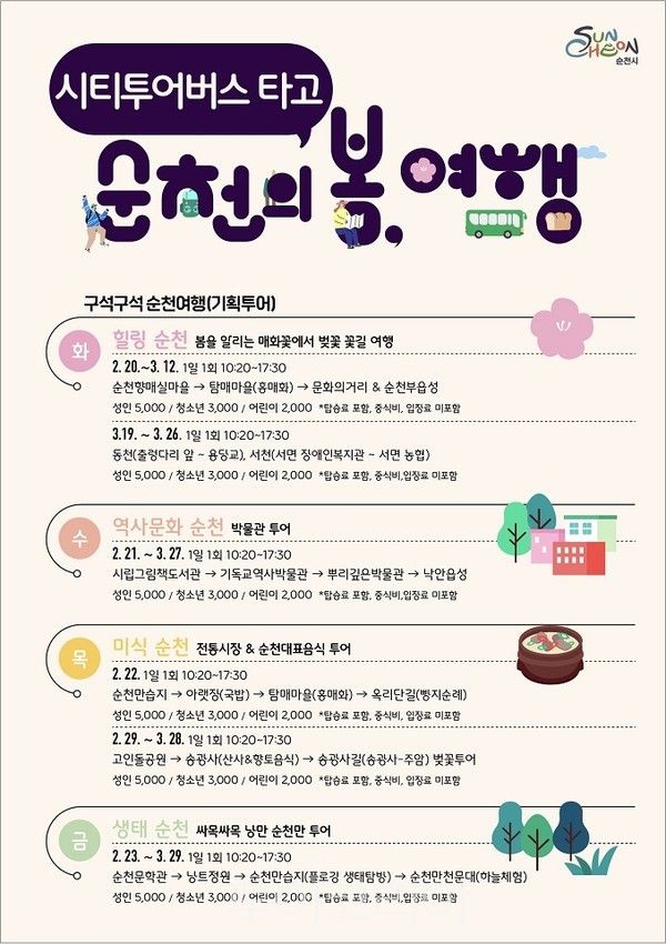 오는 20일부터 3월까지는 “순천의 봄”을 주제로 운행된다. 기획투어 주요 코스는 봄을 알리는 매화꽃과 벚꽃을 볼 수 있는 힐링순천, 순천의 대표음식을 맛볼 수 있는 미식순천, 순천만의 흑두루미와 자연을 느낄 수 있는 생태순천, 농촌·목공 등 다양한 체험할 수 있는 체험순천 등이다.