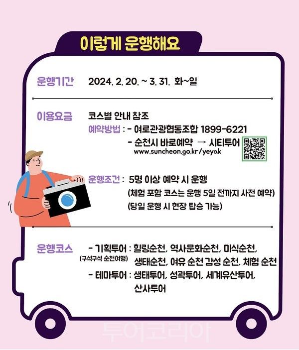 시 관계자는 “순천의 주요 관광지뿐만 아니라 체험, 축제, 마을 등 순천 전역 곳곳의 다양한 관광 콘텐츠를 경험할 수 있는 코스를 준비했다”며 “시티투어만 타면 한번에 순천을 다양하게 여행할 수 있으니 많이 이용해주시기 바란다”고 말했다.