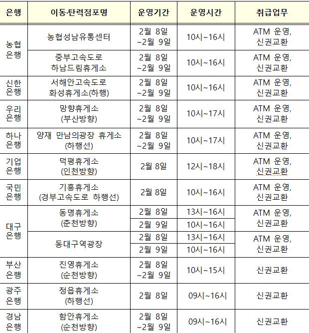 금융위원회에 따르면 8일 하루 또는 8~9일 이틀간 등 10개 은행이 전국 12개 고속도로 휴게소 이동점포에서 신권을 교환한다.