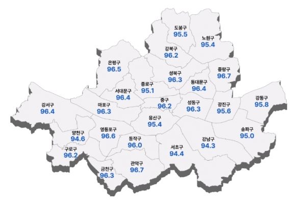 스마트스코어에 따르면 서울시 25개 자치구 중 골퍼들의 최근 9라운드 평균 타수가 가장 낮은 곳은 94.3타를 기록한 강남구였다. 이어 서초구(94.4타), 양천구(94.6타), 송파구(95타), 종로구(95.1타)가 뒤를 이었다. 평균 타수가 가장 높은 자치구는 중랑구로, 96.8타를 기록했다.