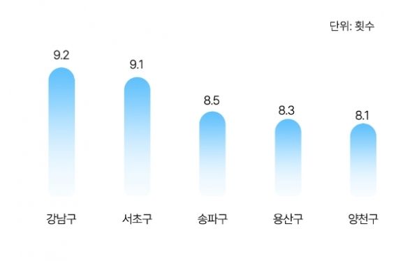 2023년 인당 스코어 입력 횟수는 강남(9.2회), 서초(9.1회), 송파(8.5회), 용산(8.3회), 양천(8.1회) 순으로 많았다. 평균 타수가 가장 낮았던 5개 자치구 중 종로구를 제외한 4개 자치구가 스코어 입력 횟수 톱5 자치구에도 포함됐다.