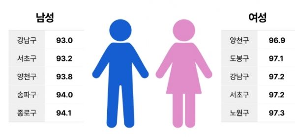 남성의 평균 스코어가 가장 낮은 자치구는 강남구(93타), 여성의 평균 스코어가 가장 낮은 자치구는 양천구(96.9타)였다. 남성 평균 타수의 경우 강남, 서초, 양천, 송파, 종로구 순으로 낮아, 전체 평균 타수 순위와 일치했다.