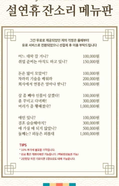 아래에는 메뉴별로 가격이 나와 있다. ‘어느 대학 갈 거니?’는 10만 원, ‘취업 준비는 아직도 하고 있니?’는 15만 원을 내야 한다. ‘돈은 많이 모았어?’, ‘차라리 기술을 배워라’ ‘회사에서 연봉은 얼마나 받니?’는 각각 10만 원, 20만 원, 50만 원이 책정됐다.