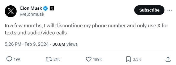 9일(현지시간) 미국 정보기술(IT) 전문매체 쿼츠에 따르면 머스크는 자신의 소셜 플랫폼 X에 “몇 달 내 전화번호 사용을 중단할 것”이라며 “X로만 문자와 음성통화 및 영상통화를 하겠다”고 밝혔다.