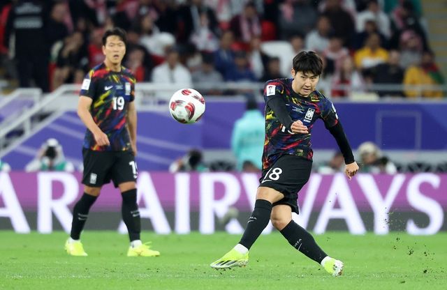 대한민국 이강인이 지난 6일(현지 시각) 카타르 알라이얀 아흐메드 빈 알리 스타디움에서 열린 2023 아시아축구연맹(AFC) 카타르 아시안컵 준결승 요르단과 대한민국의 경기에서 롱패스하고 있다. / 뉴스1