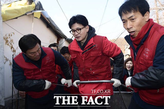 한동훈 국민의힘 비상대책위원장이 설 연휴를 하루 앞둔 8일 오전 서울 노원구 중계동 백사마을을 찾아 연탄 배달을 하고 있다. /이새롬 기자