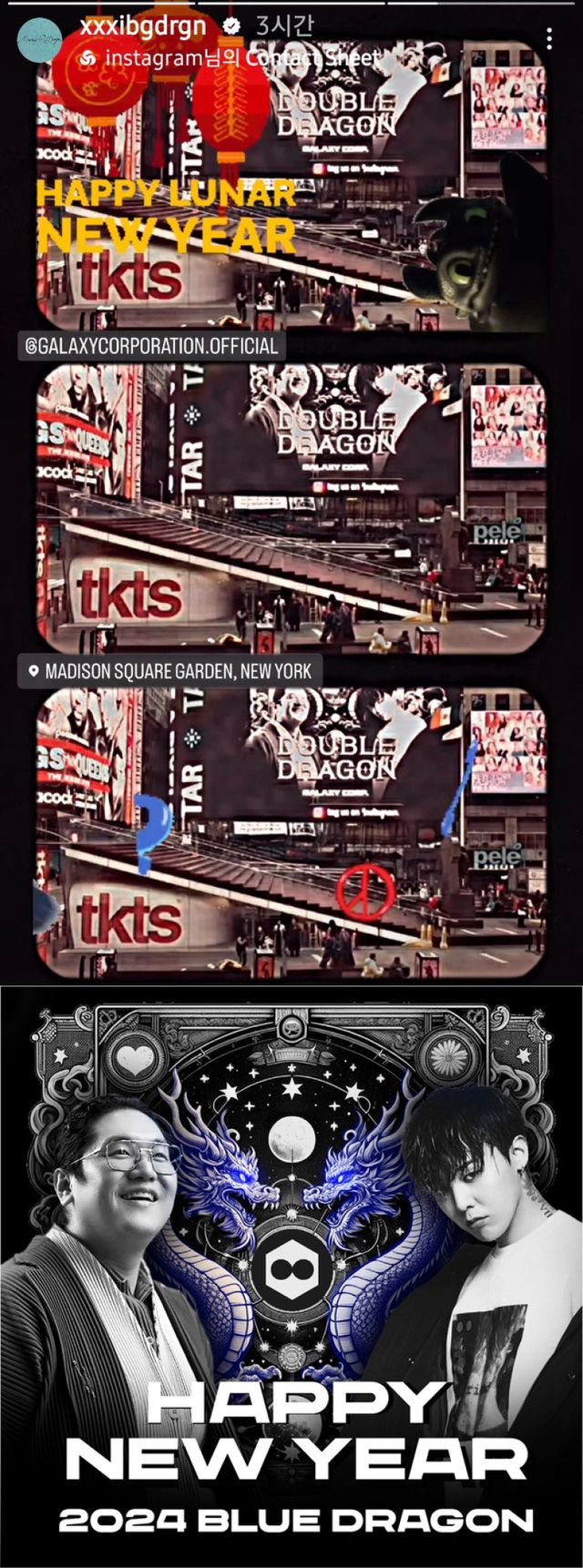 소속사 갤럭시코퍼레이션은 한국 시각 10일 뉴욕 타임스스퀘어 프랜시스 더피 동상 인근 전광판에 지드래곤과 갤럭시코퍼레이션 최용호 대표의 모습이 담긴 광고를 띄었다고 밝혔다.
