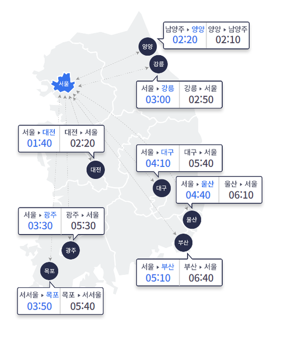 정체는 오전 10시 40분 이후 본격화 될 것으로 예상돼 광주에서 서울까지 7시간이 예상된다. 이외에도 전국 주요 도시 요금소를 출발해 서울까지 걸리는 예상시간은 부산 4시간 50분, 울산 4시간 20분, 대구 3시간 50분, 강릉 2시간 50분, 대전 1시간 30분이다.