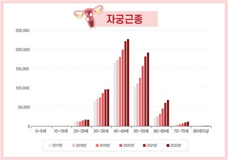 환자 수는 가임 연령대인 30~40의 경우, 2022년에 323,506명으로 전체 자궁근종 환자의 50% 이상을 차지했다. 50대도 증가세를 보였다.