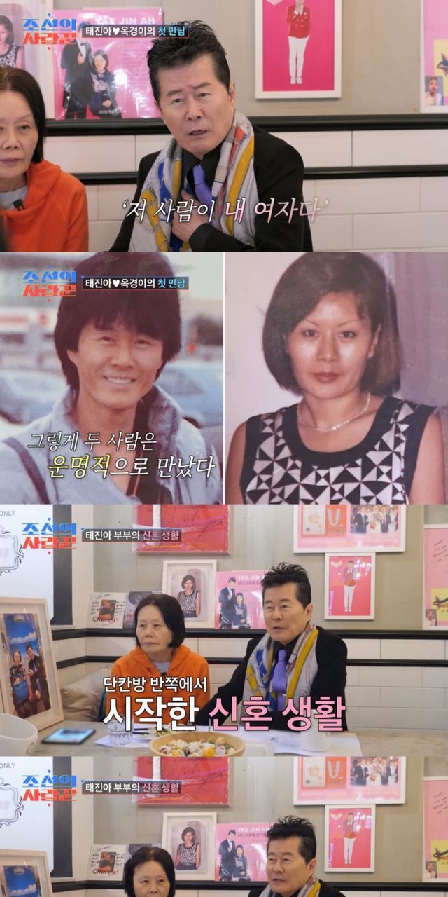 태진아는 “지난 1981년 8~9월 사이였다. 미국 뉴욕의 한식당에서 밥을 먹고 있는데 아내가 친구들과 들어왔다”며 “그 순간 여러 명 중에서도 이 사람 얼굴만 내 눈에 딱 들어오더라”라고 운명적인 순간을 돌아본다. 이어 “이 사람 얼굴 뒤에서 광채가 나는 느낌이었다. ‘저 사람이 내 여자다’라는 생각이 들었다”고 첫눈에 반했음을 밝힌다.