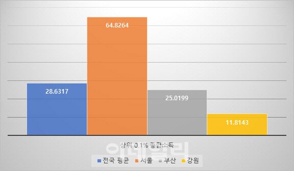 상위 0.1%의 평균 소득이 가장 낮은 지역은 강원으로 11억8143만원으로 서울과는 5.5배 가량 차이가 났다.
