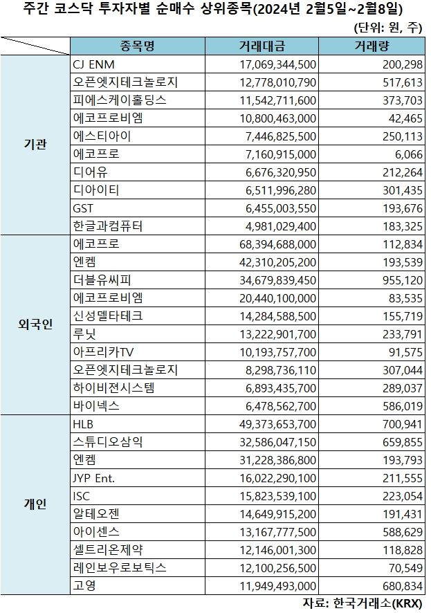 기관 'CJ ENM'·외인 '에코프로'·개인 'HLB' 1위 [주간 코스닥 순매수- 2월5일~2월8일]