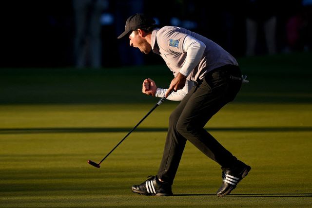 닉 테일러가 18번홀에서 진행된 연장 2차전에서 버디 퍼트를 넣은 뒤 환호하고 있다. (사진=AFPBBNews)
