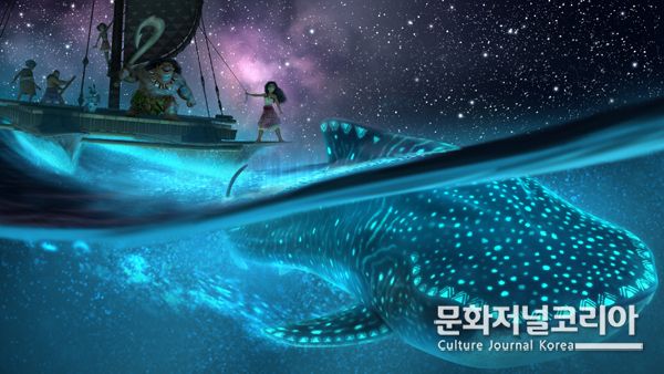 공개된 퍼스트룩 스틸에는 밤 바다를 배경으로 장대한 모험에 나서는 ‘모아나’와 ‘마우이’, 그리고 그들의 길잡이가 되어주는 거대한 고래상어의 모습이 담겼다.