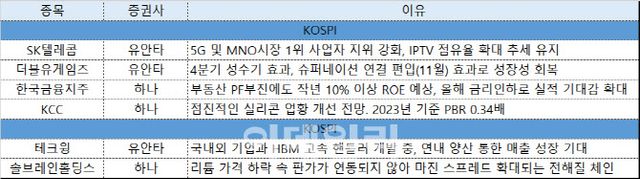 하나증권은 금융주, 특히 증권주에 주목하며 한국금융지주(071050)에 러브콜을 보냈다. 한국금융지주의 PBR은 0.4배에 불과하지만, 부동산 프로젝트 파이낸싱(PF) 부진에도 지난해 10% 이상 자기자본이익률(ROE)이 예상되고 있으며, 올해 금리 하락에 실적 반등도 기대된다.