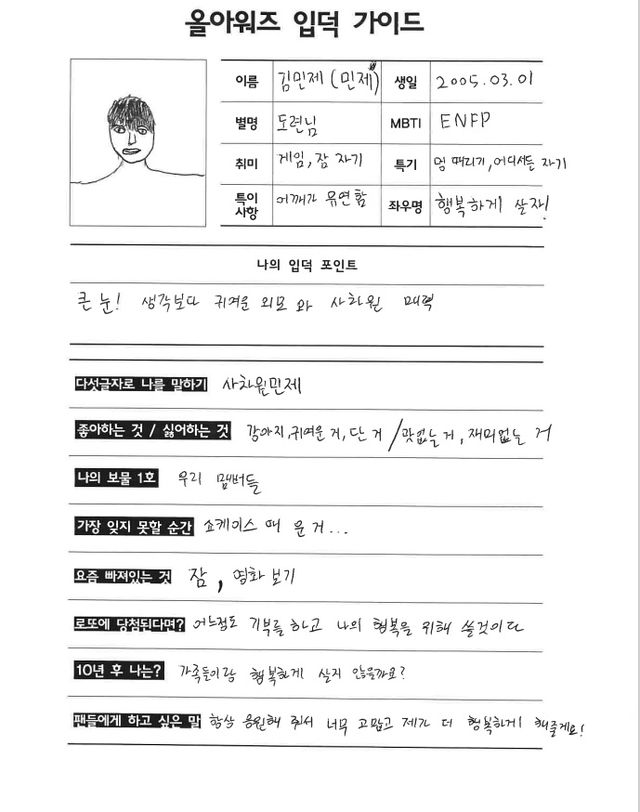 민제 - 저희 재즈 댄스를 알려주시는 안무가 선생님이 지어주셨어요. 제가 하는 행동을 보고 단숨에 '너는 도련님이네' 하시더라고요. 멤버들도 좀 인정하기도 했고요. 다들 제가 외동 아니면 누나가 있는 막내라고 생각하시지만 남동생과 여동생이 있는 첫째에요.