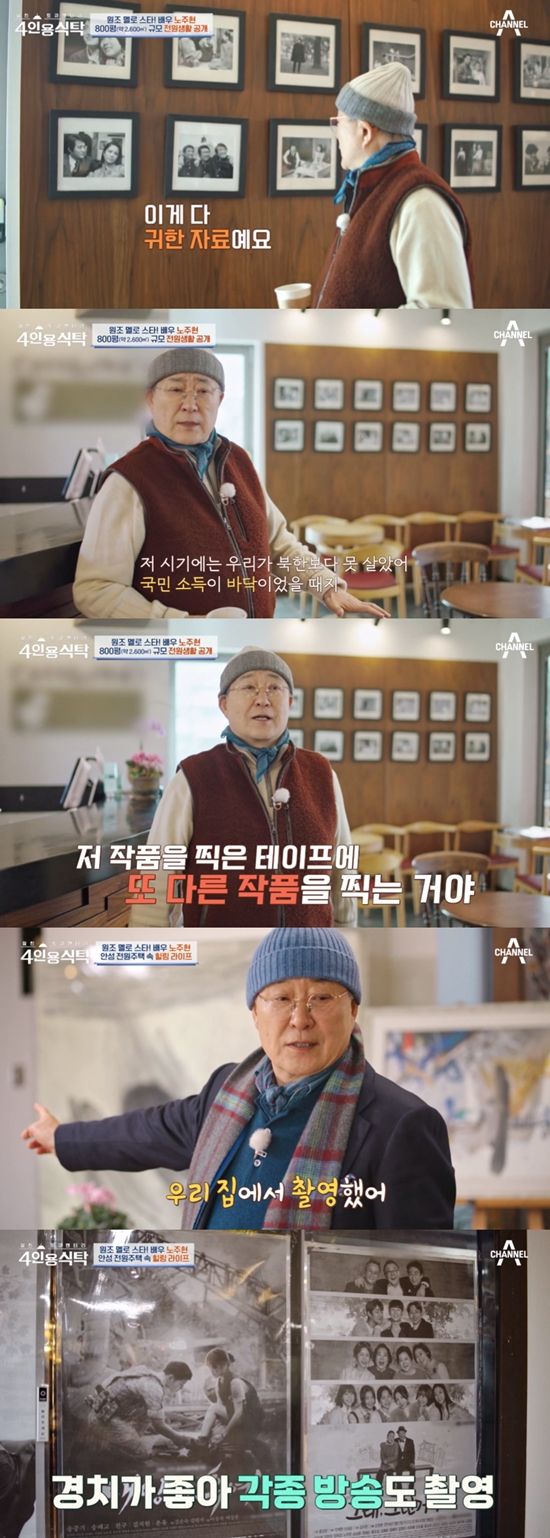 카페 한 편에는 옛날 작품의 사진들이 전시돼 있었다. 젊은 시절의 노주현의 모습이 담긴 사진들이다. 그는 "저 시기에는 우리가 북한보다 못 살았다. 국민 소득이 바닥이었을 때"라며 "그때 (1960년대) 우리가 데뷔했는데 방송사가 아끼느라고 촬영 테이프를 재활용했다. 저 작품 찍은 테이프에 또 다른 작품도 찍는 것"이라고 말했다.