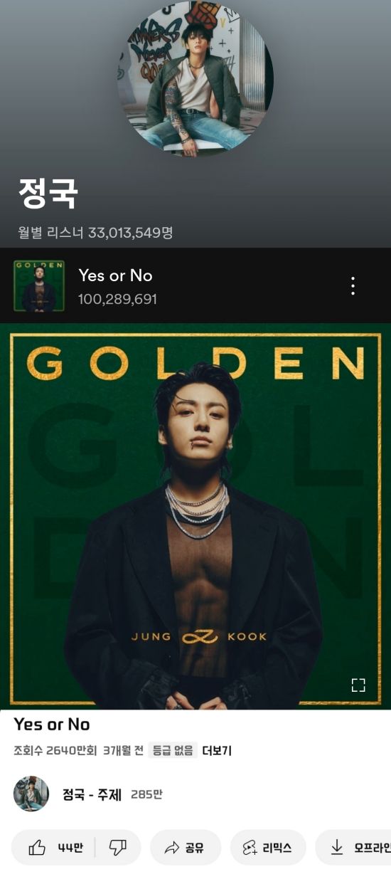 최근 방탄소년단(BTS) 정국의 'Yes or No'(예스 오아 노)가 '스포티파이'(Spotify)에서 1억 스트리밍을 돌파했다.