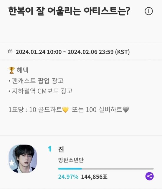 1월 24일부터 2월 6일까지 팬캐스트(Fancast)에서는 "한복이 잘 어울리는 아티스트는?" 투표를 진행했다.