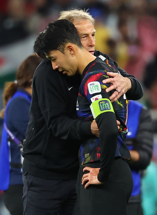 아시안컵 4강전 한국과 요르단 경기가 끝난 뒤 위르겐 클린스만 감독이 손흥민을 위로하고 있다. 사진=연합뉴스