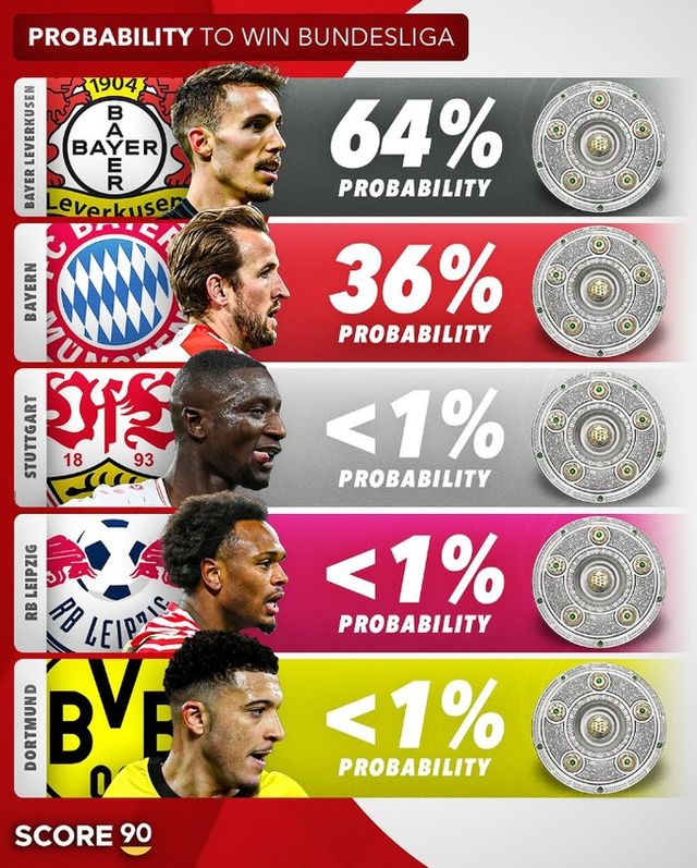 하지만 불안한 경기가 계속되고 있으며, 대항마 레버쿠젠에 덜미를 잡히고 왕좌를 내줄 위기에 처했다. '스코어 90'은 '베트 365'가 전망한 독일 분데스리가 우승 확률을 짚으며, 레버쿠젠이 올 시즌 처음 우승 후보로 올라섰다고 조명했다. 토트넘 시절 무관에 지쳤던 케인이 합류한 다음 뮌헨이 우승 실패 위기에 직면했다.