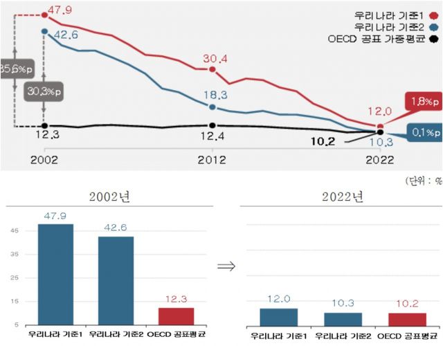 장시간 근로자 비중 추이를 비교하면 2002년에는 우리 임금근로자 중 장시간 근로자 비중이 OECD 평균보다 월등히 높았다. 하지만 이후 한국의 장시간 근로자 비중이 25% 수준으로 감소하며 OECD 평균과 비슷해진 것으로 분석됐다.