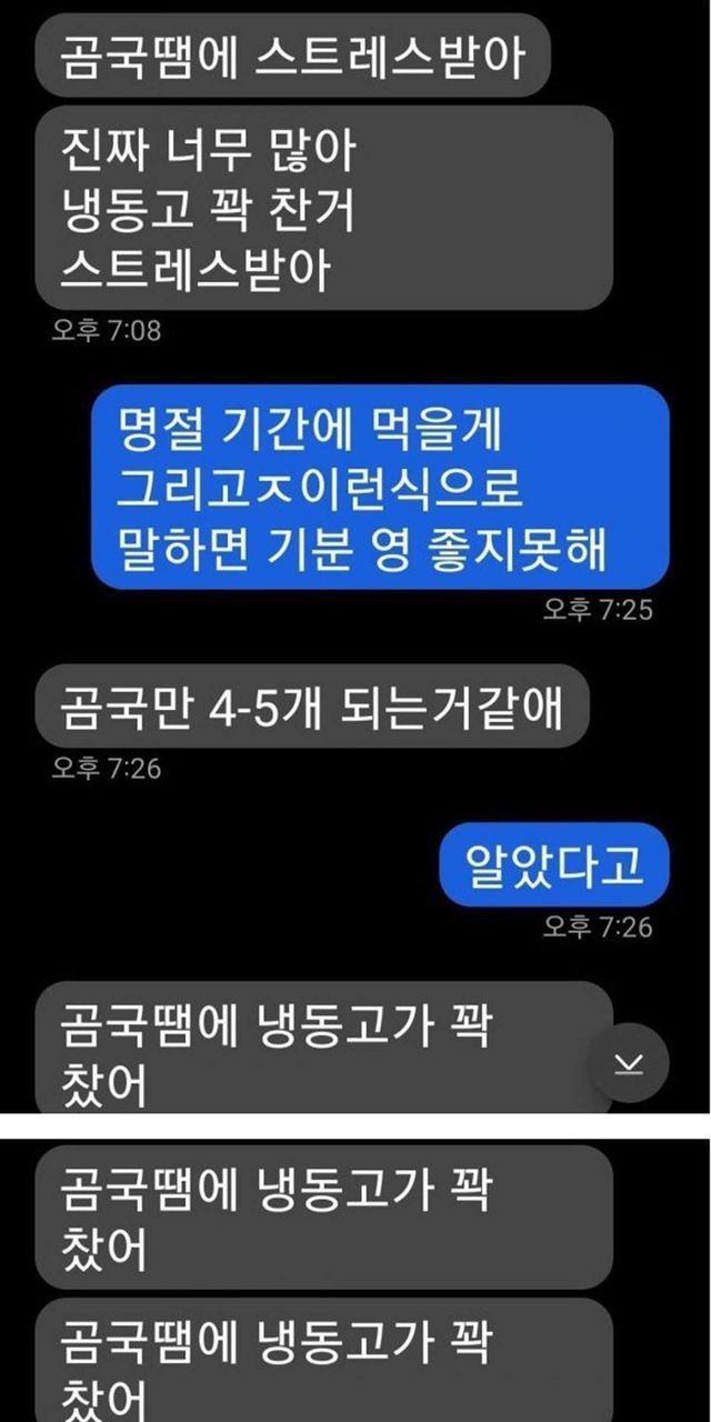 아내가 글쓴이에게 문자메시지로 “곰국 때문에 스트레스받아. 진짜 너무 많아. 냉동고가 꽉 차 스트레스 받아”라고 말한다. 글쓴이는 “명절 기간에 먹을게. 그리고 이런 식으로 말하면 기분이 영 좋지 못해”라고 답한다.