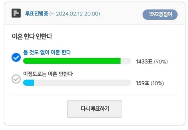 한 누리꾼은 인터넷 커뮤니티에서 해당 사연을 소개하고선 글쓴이가 어떻게 해야 하는지 묻는 투표에 부쳤다. 그러자 응답자 1592명 중 90%인 1433명이 “볼 것도 없이 이혼한다”고 답했다. “이 정도로는 이혼 안 한다”고 답한 누리꾼은 10%인 159명이었다.