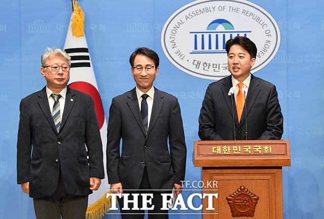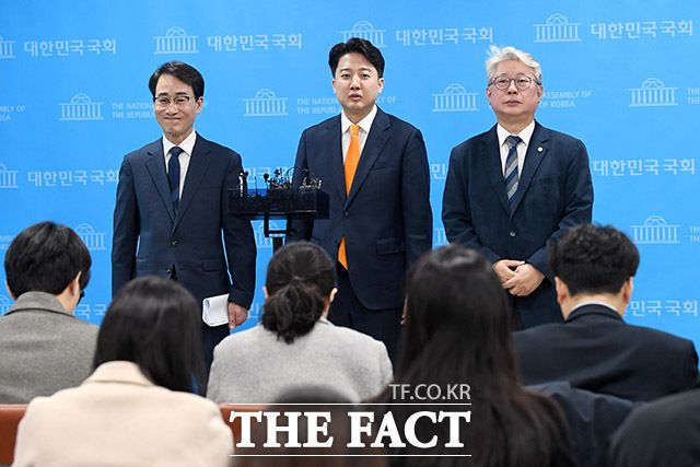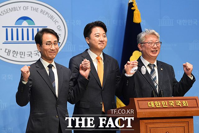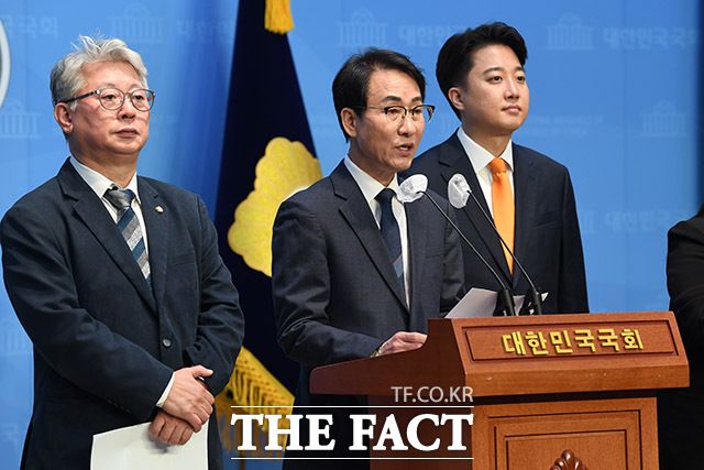 [더팩트ㅣ국회=남용희 기자] 이원욱 의원과 이준석 개혁신당 공동대표, 조응천 의원(왼쪽부터)이 13일 오전 서울 여의도 국회 소통관에서 제22대 총선 출마 선언을 한 뒤 기념촬영을 하고 있다.