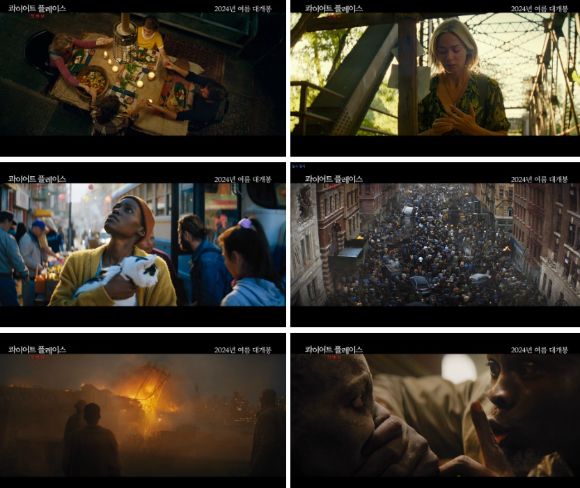 이내 폭발과 함께 순식간에 아수라장이 된 뉴욕 한복판에 정체를 알 수 없는 괴생명체가 나타나 사람들을 무차별로 공격하기 시작한다. 손에 땀을 쥐게 하는 재난 상황이 긴박하게 이어지는 가운데 “모든 소리가 사라진 첫째 날”이라는 카피는 지금껏 공개되지 않은 그날의 이야기에 대한 궁금증을 고조시킨다. 뿐만 아니라 무너져 내리는 브루클린 다리부터 고층 빌딩을 타고 내려오는 괴생명체 무리까지 대도시로 확장된 배경과 압도적인 재난 상황은 한층 더 거대해진 스케일을 예고하며 기대감을 더한다.