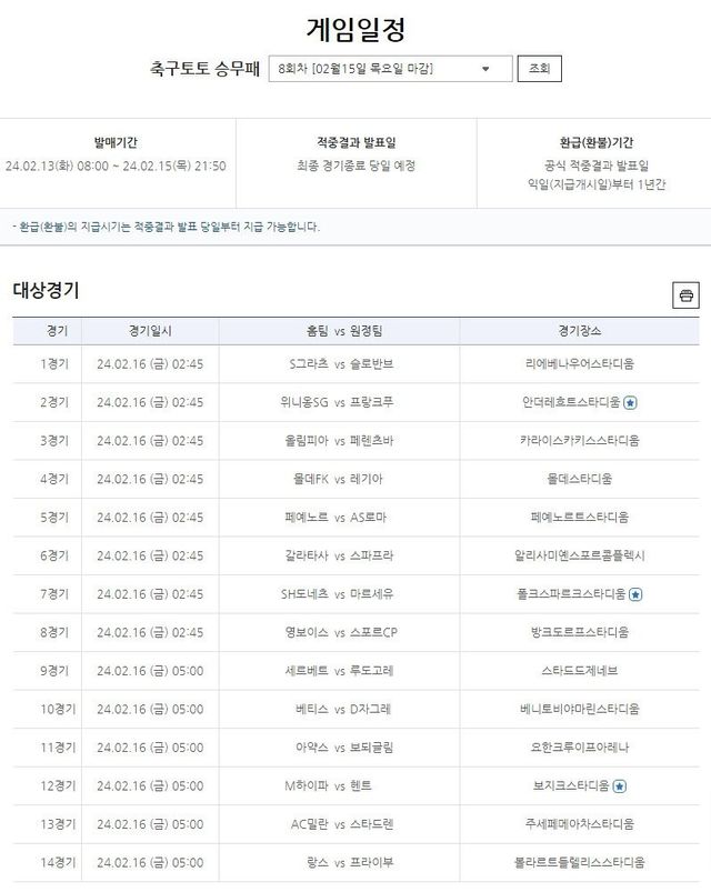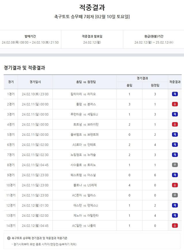 한편 축구토토 승무패 7회차 적중에 성공한 축구팬들은 2025년 2월 12일(수)까지 1년 이내 전국 토토판매점 또는 우리은행 지점에서 적중금을 찾아갈 수 있으며, 이어지는 축구토토 승무패 8회차 게임은 15일(목) 오후 9시50분까지 구매가 가능하다.