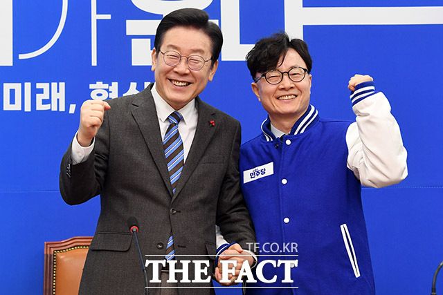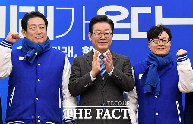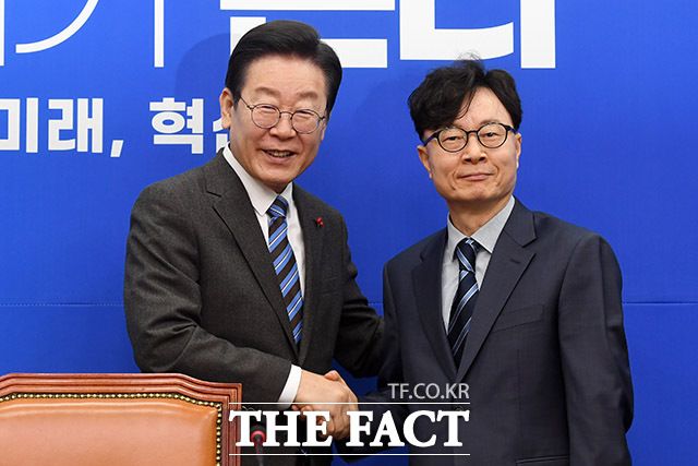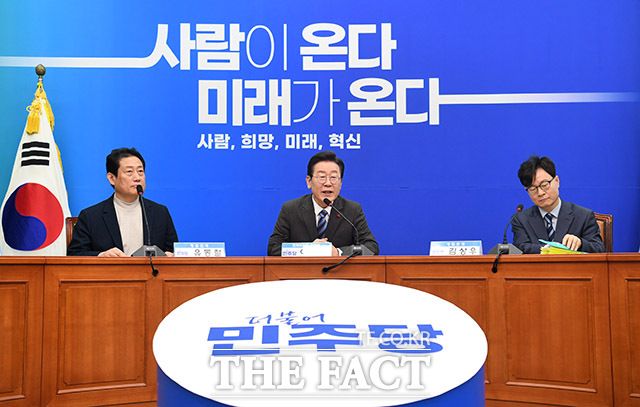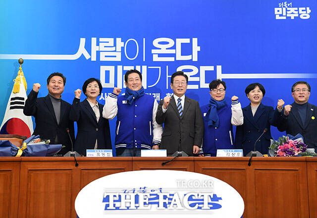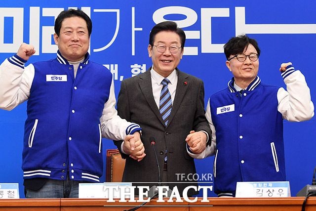 [더팩트ㅣ국회=남용희 기자] 더불어민주당 영입인재인 유동철 동의대 사회복지학과 교수와 이재명 더불어민주당 대표, 김상우 안동대 경영학과 교수(왼쪽부터)가 14일 오전 서울 여의도 국회에서 열린 인재환영식에서 기념촬영을 하고 있다.