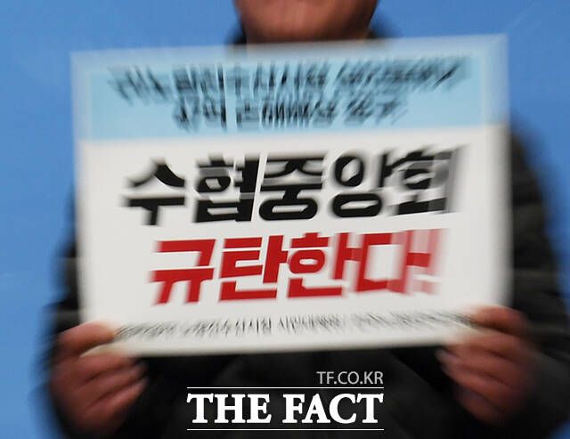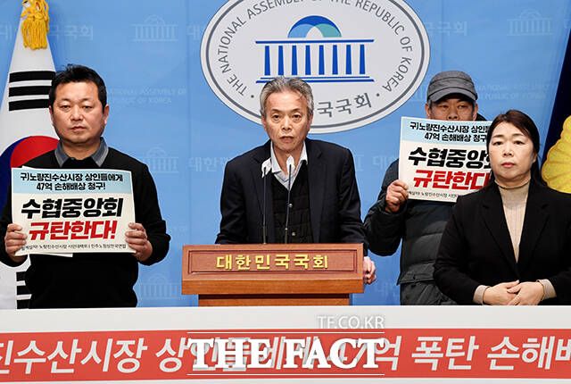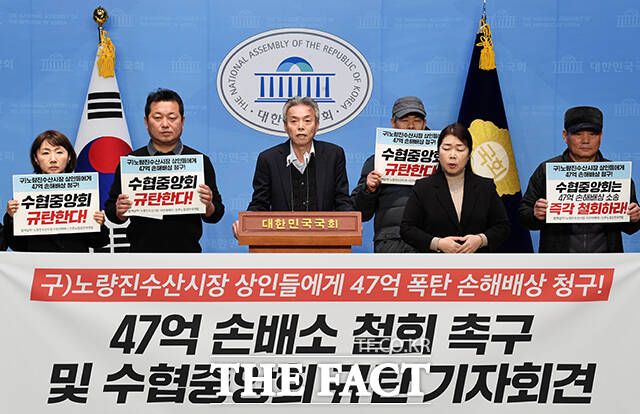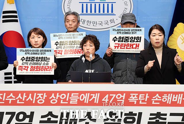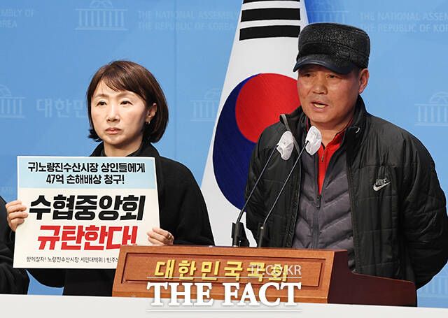 [더팩트ㅣ국회=배정한 기자] 노량진수산시장 시민대책위원회와 민주노점상전국연합 관계자들이 14일 오전 서울 여의도 국회 소통관에서 47억 손배소 철회 촉구 및 수협중앙회 규탄 기자회견을 열고 발언을 하고 있다.