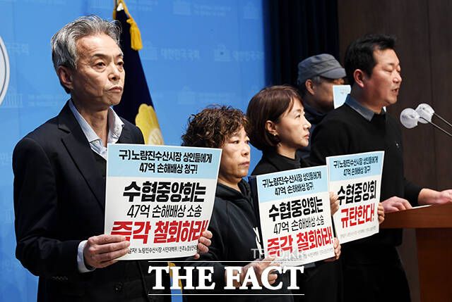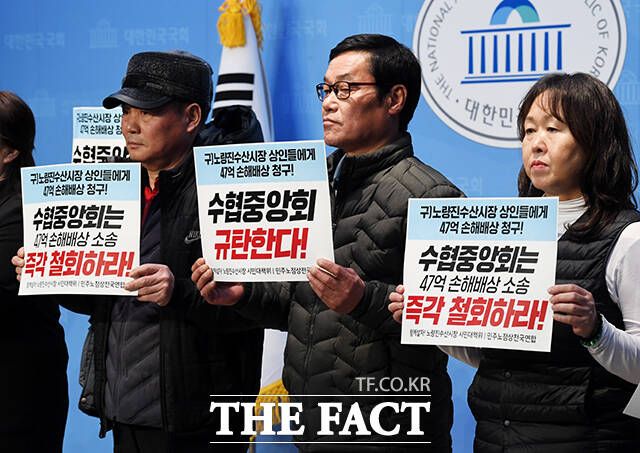 노량진수산시장 시민대책위는 기자회견문을 통해 "수협중앙회는 구 시장 상인들이 구 시장 부지 주차장 무단 점용 및 용역시설관리미 명목으로 상인들에게 47억 원의 손해배상을 청구했다"라며 "법원의 판결이 수협 측의 손을 들어준다면 생계터에서 쫓겨난 상인들에게 사형선고를 하는 것과 다름없다"고 수협중앙회의 손해배상 청구 철회를 요구했다.