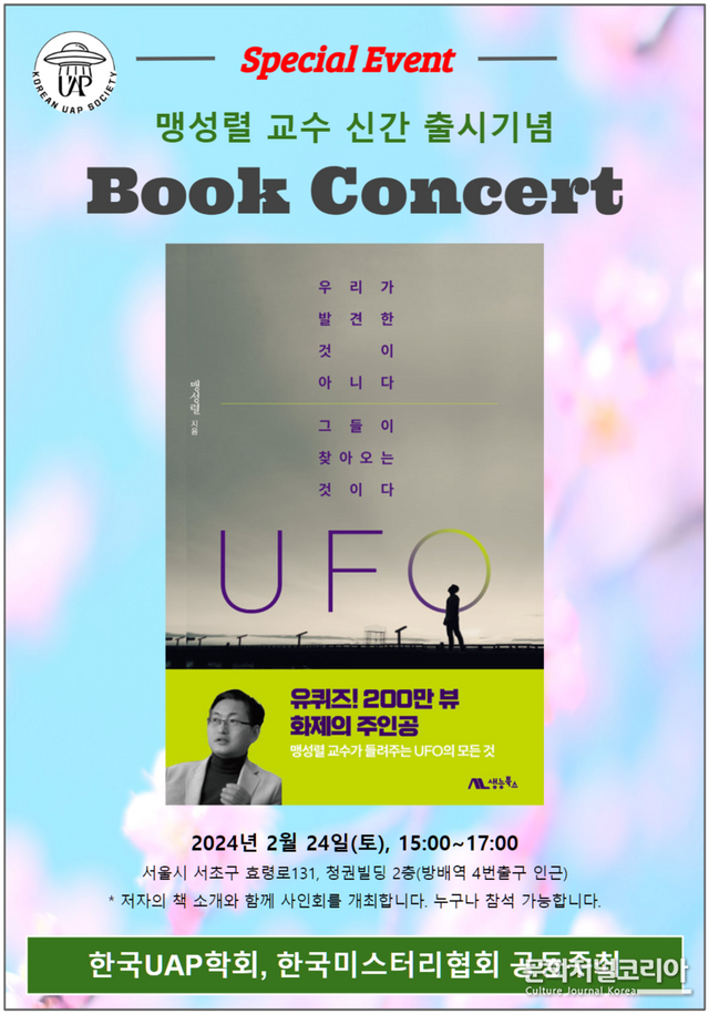 한편 그의 책 [유에프오] 출간을 기념으로 한국UAP학회와 한국미스터리협회 공동주최로 2024년 2월 24일(토) 북 콘서트를 개최하여 독자들에게 좀 더 다가가는 시간을 갖기로 하였다.