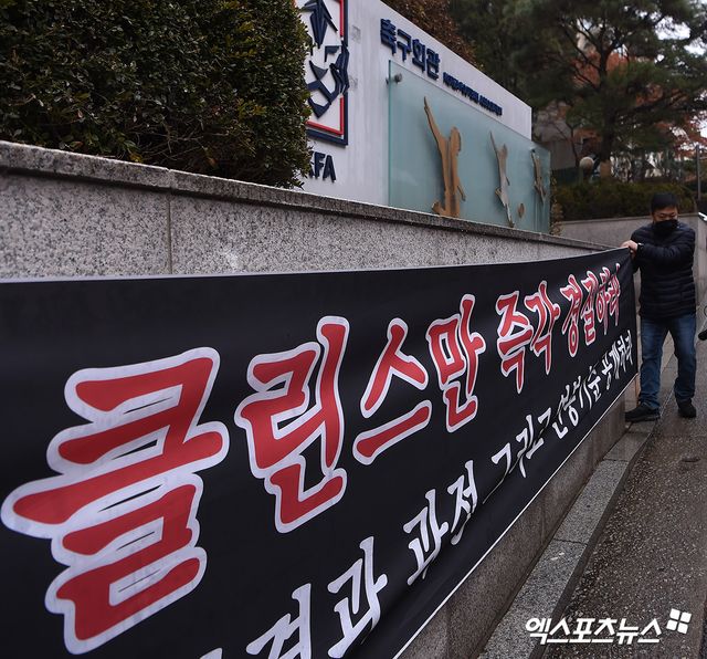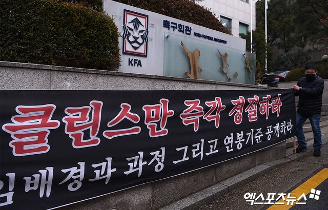 (엑스포츠뉴스 신문로, 나승우 기자) 한국축구를 향한 축구 팬들의 분노가 위르겐 클린스만 감독, 정몽규 회장을 향했다. 축구협회가 있는 축구회관에서 시위를 열고 즉각 사퇴를 촉구했다.
