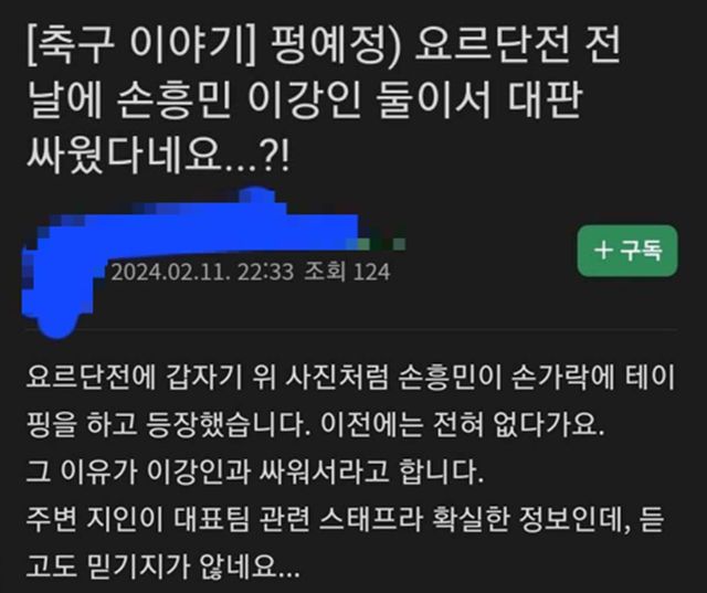 지난 11일 누리꾼 A씨는 한 포털 커뮤니티에 '요르단전 전날에 손흥민, 이강인 둘이서 대판 싸웠다네요'라는 제목의 글을 올렸다.