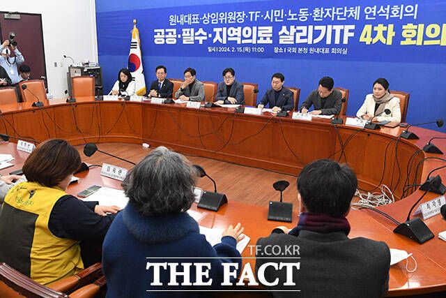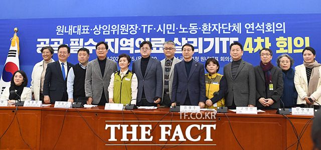 [더팩트ㅣ국회=남용희 기자] 홍익표 더불어민주당 원내대표(가운데)와 참석자들이 15일 오전 서울 여의도 국회에서 열린 공공·필수·지역의료 살리기TF 4차회의에서 기념촬영을 하고 있다.