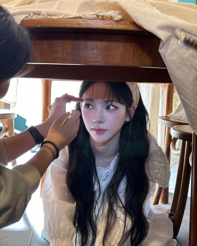 공개된 사진 속 카리나는 촬영장으로 보이는 공간에서 메이크업을 받는 모습인가 하면, 셀카를 찍고 있다.