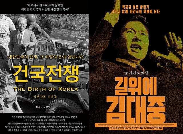 극장가의 정치 다큐멘터리 흥행 경쟁이 선거전만큼 뜨겁다. 이승만과 김대중 전 대통령을 다룬 영화 ‘건국전쟁’과 ‘길 위에 김대중’(왼쪽부터)이 이례적 흥행을 기록하며 주목 받고 있다. 사진제공|다큐스토리프로덕션·명필름